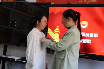 随后,学院团委书记欧阳阳和老团员代表们一起,逐一为新团员佩戴上团徽,这一刻,新团员们正式成为了共青团大家庭的一员。佩戴团徽不仅是对他们身份的认可,更是对他们未来成长道路上的期许和鞭策。