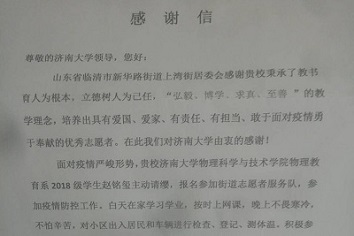 乌云遮不住升起的太阳,疫情挡不住春天的来临。7月15日,必一运动(官方网站)B·Sport-权威运动资讯网站收到一封来自“临清市新华路街上湾街居委会疫情防控指挥部”的感谢信,感谢我校培养出爱国、爱家、有责任、勇于面对疫情、勇于奉献的优秀志愿者,感谢必一运动(官方网站)B·Sport-权威运动资讯网站物理教育系2018级学生赵铭玺同学疫情期间为当地防疫工作做出的贡献。