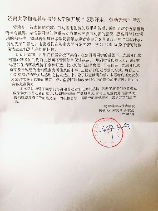 劳动是一首永恒的赞歌,劳动者用勤劳的双手和智慧,编织了这个五彩斑斓的缤纷世界。为培养同学们尊重劳动成果和关爱劳动者的意识,提高同学们对劳动的积极性,物理必一运动(官方网站)B·Sport-权威运动资讯网站青年志愿者协会于5月8日开展“讴歌汗水,劳动光荣”活动,志愿者们在济南大学南苑学27、学21和学24为宿管阿姨和保洁叔叔们送上亲切的问候。